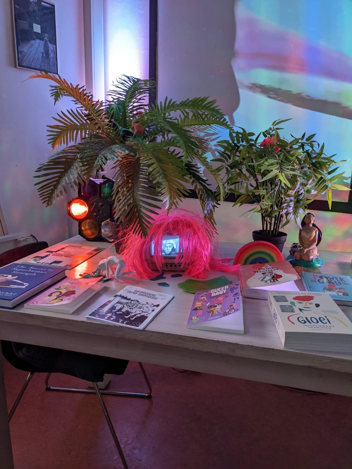This work was made in the context of a youth centre/cultural centre of Flinty’s in Haarlem during the Queer Kunstlijn Exhibition, including works of Rowena Buur, Aileen Yee, Mojdeh Feili, Najiba Yasmin, and was curated by Anne Mul. This was the first of many queer hang outs and the first library we tried out. We will continue expanding our collection and sharing it in hang out and educational get togethers.